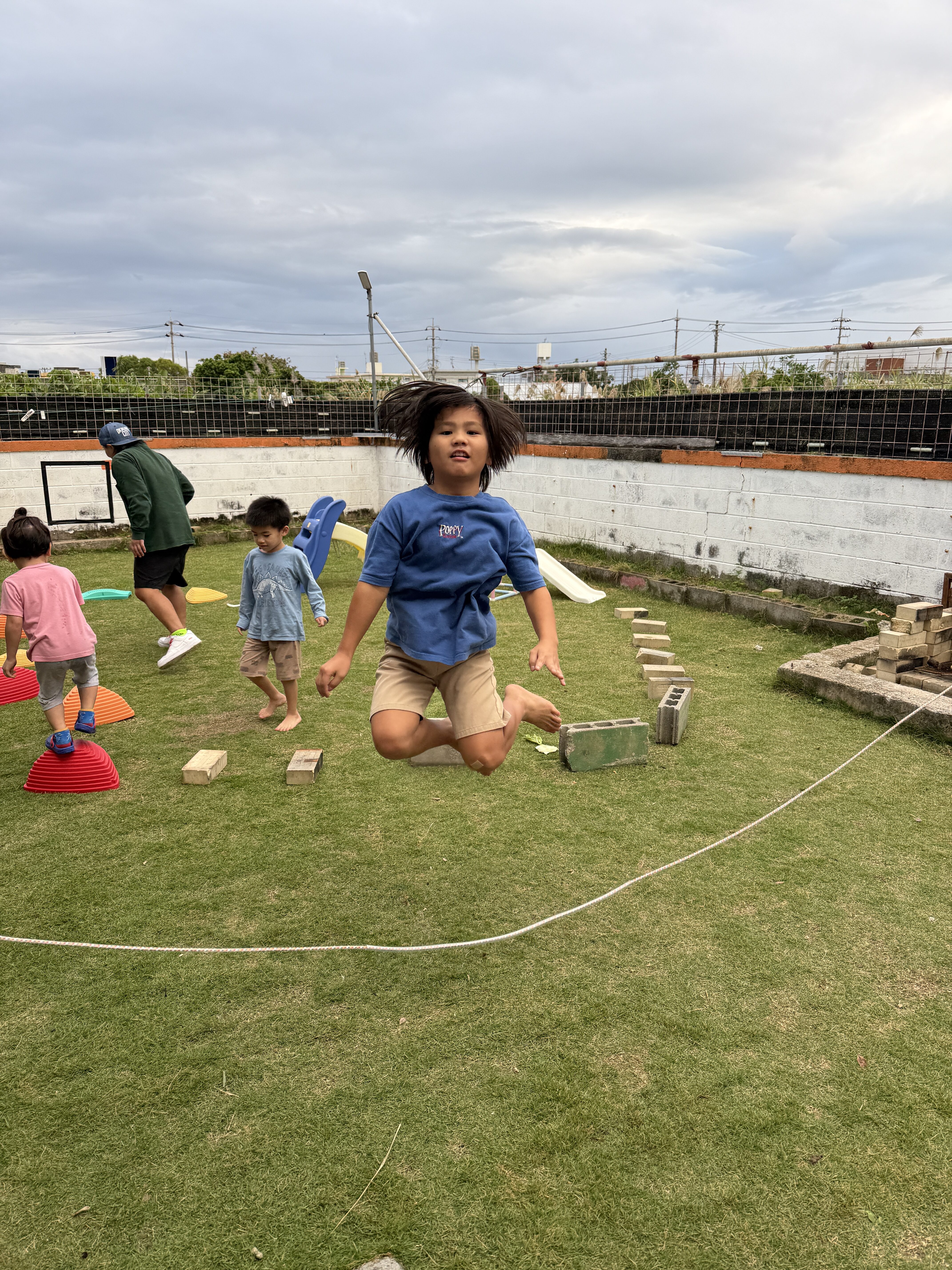 庭ではサーキット場を作り、その上を上手に歩いたり、縄跳びをしたりとたくさん体を動かしました💪🎶