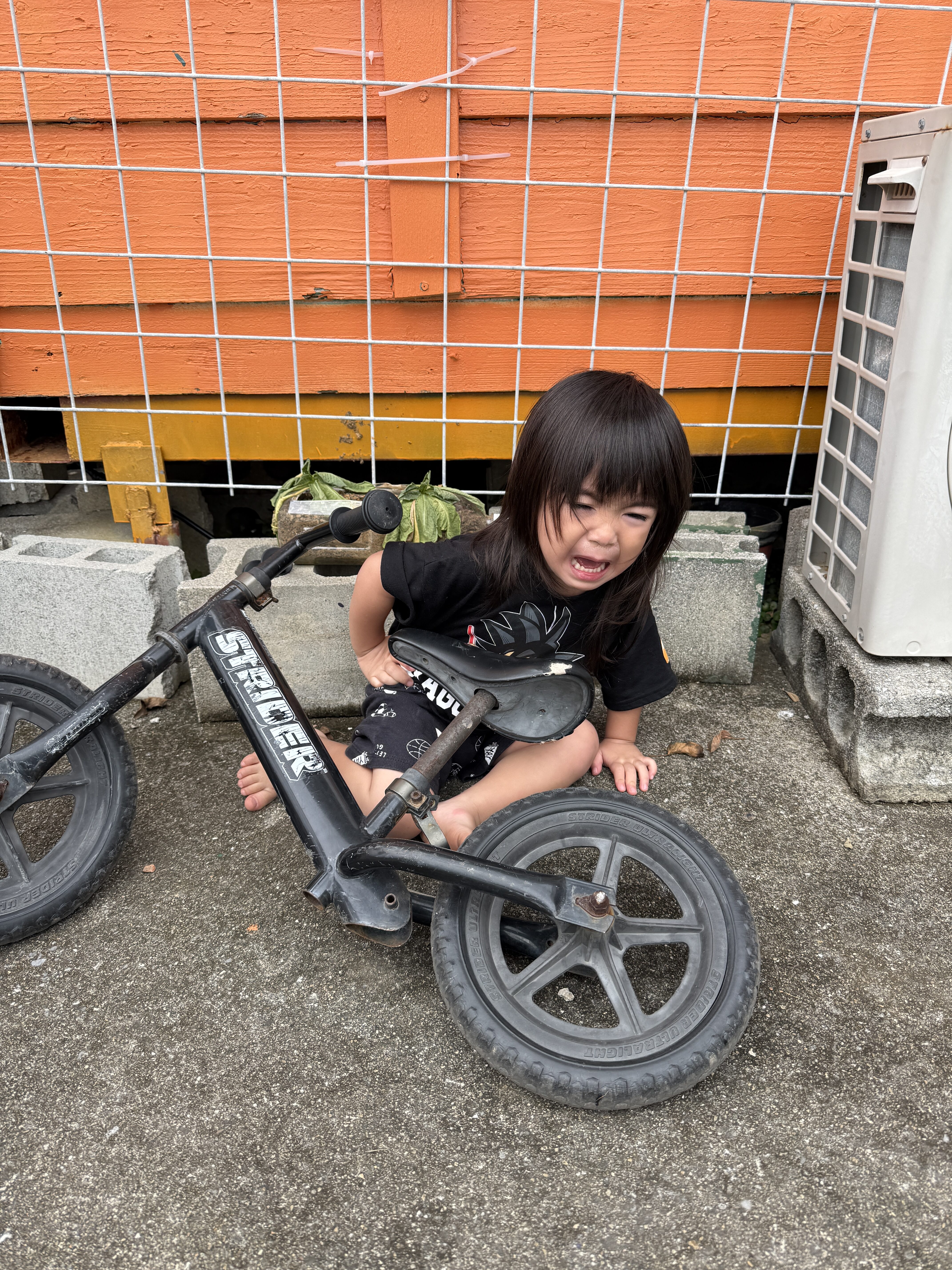 アジトの庭で自転車に乗って遊び、転んで泣いて、でもすぐ元気に😊🚲