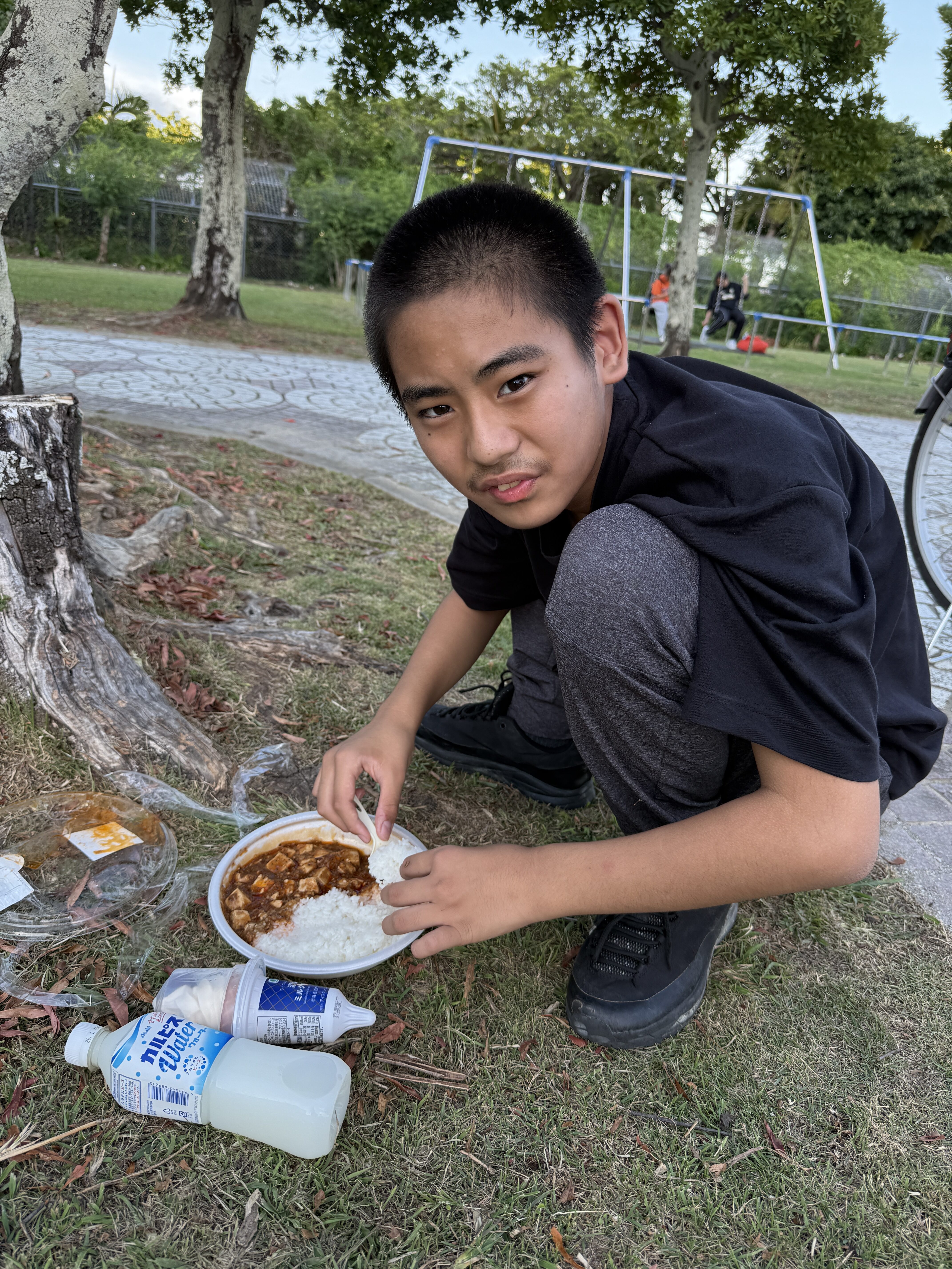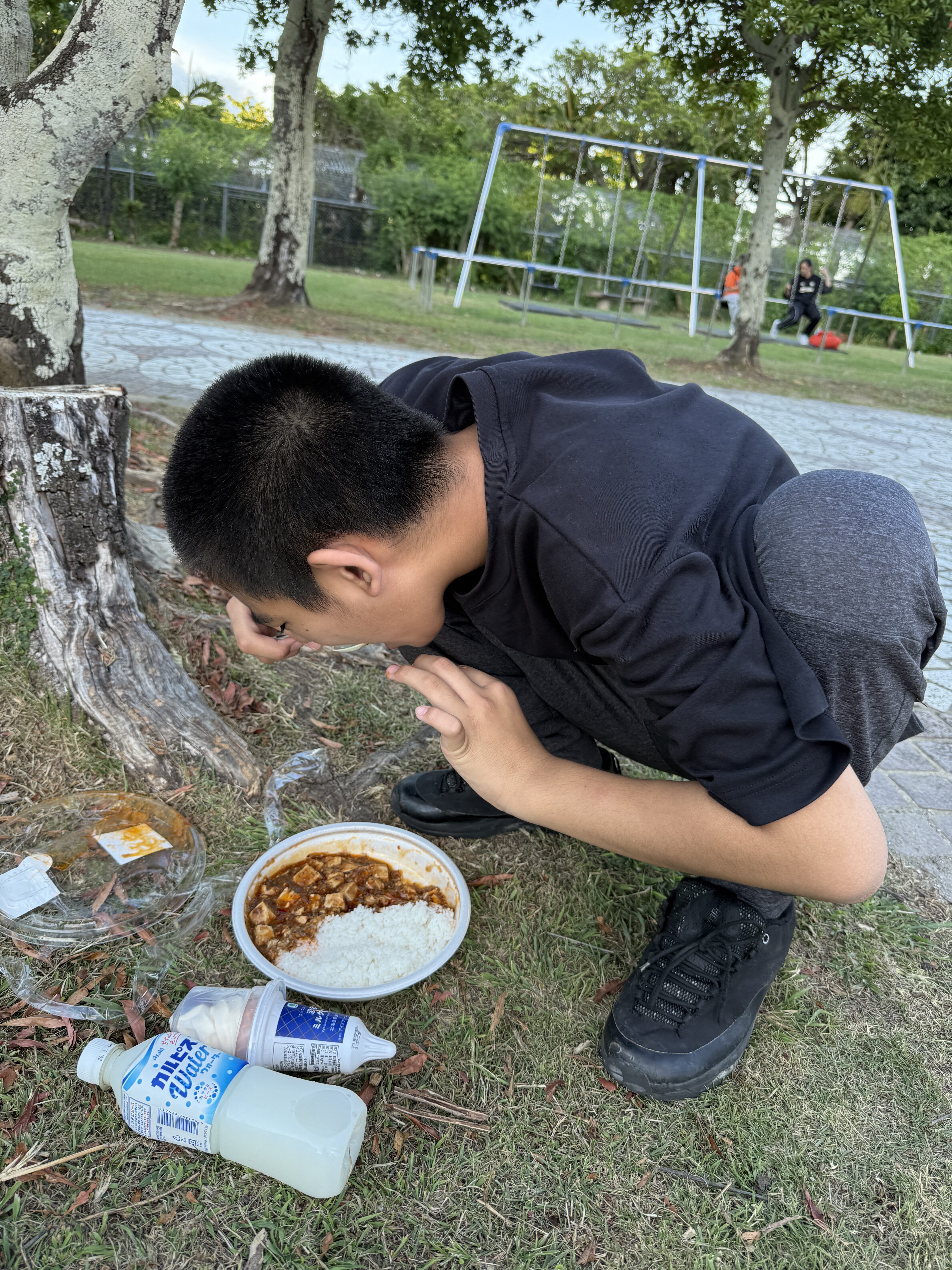 外で食べるご飯は格別で、とても美味しそうにニコニコしながら食べていました。